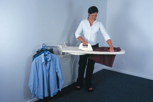 Wall-Mounted, Full-Size, 180-degree Swiveling Ironing Board, includes Padded Cover, Iron Rest, Clothes Rack, Wall Cover, Fixing Hardware, Mounting and Operating Instructions. Unfold and iron with the Fold-Away Ironing Center! This ironing board mounts to a single wall stud, using normally unused wall space. Unfold, and you have a full size, sturdy, steel mesh ironing board. The wall mounted ironing board comes with padded cloth cover, convenient iron rest, and extendable clothes rack. Exclusive ironing board opens parallel to wall and rotates 180 degrees for use at any angle. Patented, space-saving design folds away when not in use to 25-inch by 23-inch with a mere 4-1/2-inch wall profile. .