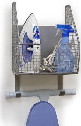 Convenience and storage at their best. Perfect for your laundry room, this single basket holds an iron and starch while the ironing board hangs below. The large basket keeps everything handy and the unique handle slot accommodates most styles of irons. The hook will hold both "T" and "Y" style ironing boards and can be removed for use as a storage basket. Mounting hardware included. Spectrum is a company that does the small stuff great! Their items are made of better plastics, heavier steel, thicker powder coating, and stronger castings. Spectrum inspects every piece before it leaves their factory, so you know you'll always get top quality products. Measures 18-1/4" tall by 11" wide by 7-3/4" deep. Pewter color.